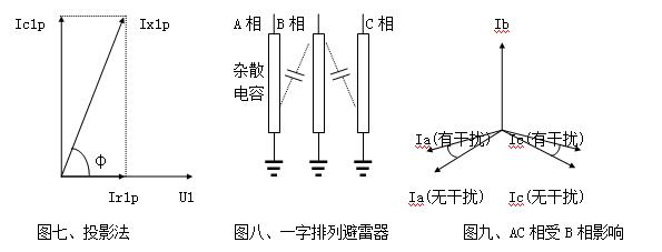 現(xiàn)場(chǎng)測(cè)量時(shí),一字排列的避雷器(圖八),中間B相通過(guò)雜散電容對(duì)A、C泄漏電流產(chǎn)生影響,使A相φ減小,阻性電流增大,C相φ增大,阻性電流減小甚至為負(fù),這種現(xiàn)象稱相間干擾(圖九)。