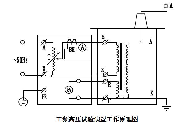 工頻高壓試驗(yàn)裝置的工作原理圖見下圖。
